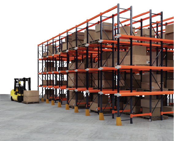 Sistema Drive-In diseñado para almacenar grandes volúmenes de productos homogéneos, optimizando espacio y permitiendo el acceso del montacargas dentro de la estructura para una carga y descarga eficiente.